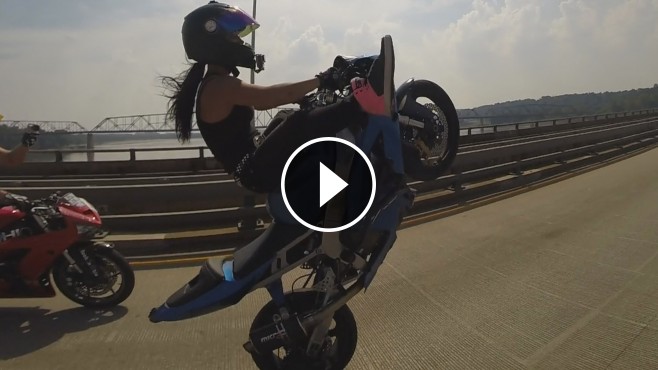 Check out this extreme freestyle street bike stunt rider who is a female do awesome motorcycle stunts on the highway a crossed a very long bridge on the Missouri & Illinois boarder on interstate 270 in Saint Louis, MO area for Streetfighterz ROC Ride Of The Century 2015 annual sport bike stunt riding street ride held in September 2015.