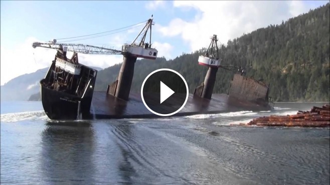 But, from what's reported, this isn't an accident but a barge in British Columbia, Canada that is loaded with an incredible huge amount of timber. We have no idea about whether this kind of unload practice is widespread in Canada or in somewhere else in the world, but this is totally crazy! That must be one of the most unusual ways of unloading timber into the water.