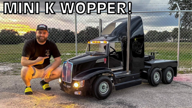 Take a look of custom exclusive mini vehicle with walk around, owner story, all explanations in details, outside view, riding and driving, clean animation. This is a successful creation of art, creating masterpiece 4FT Tall Kenworth Semi Truck we have an opportunity to see.